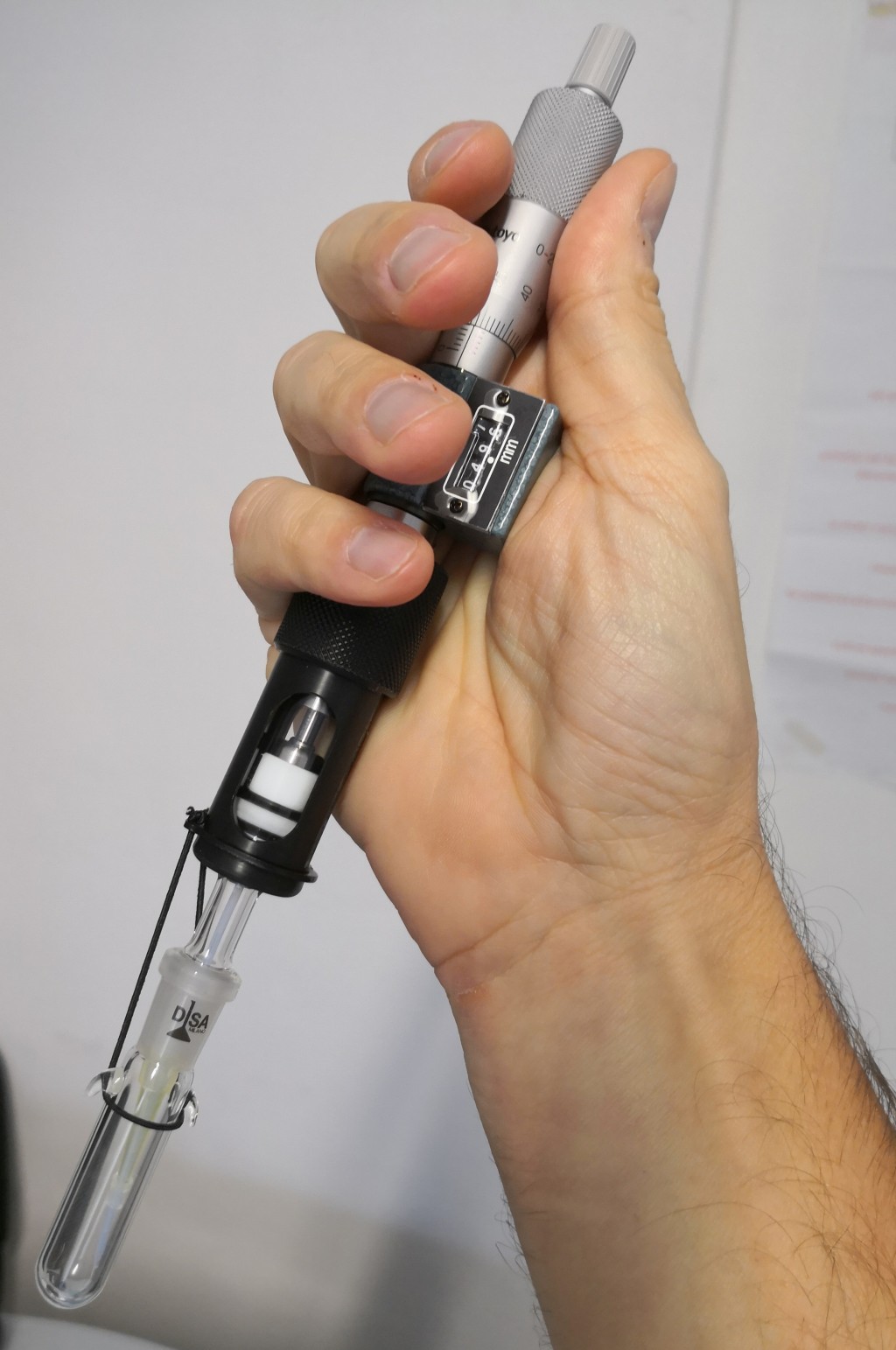 Il microdosimetro TerreLogiche è composto da una testa micrometrica collegata ad un pistoncino sistemato all’interno di un corpo in vetro Duran calibrato. L’insieme agisce come una siringa di precisione. Ad ogni avanzamento del pistoncino di 1/100 di mm, viene erogato un volume di 1 μl di soluzione titolante. Il contatore analogico (o la lettura della misura sul nonio) permette di controllare con facilità il volume erogato durante la titolazione.